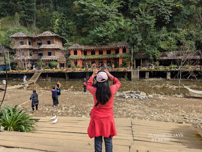 | 從木橋的下方可以往上拍,剛剛走下來木式吊腳樓的房屋(其實目前就是小餐廳或是紀念品商店) |
